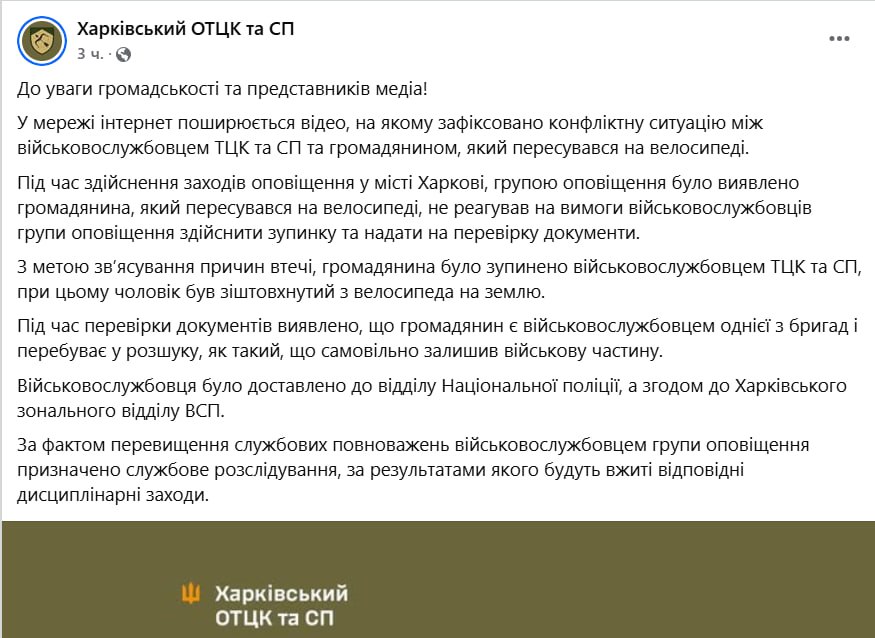 Вони заявили, що чоловік на велосипеді, затриманий в Харкові військовослужбовцями ОТЦК та СП, перебував у розшуку, оскільки був військовим однієї з бригад та самовільно покинув свій підрозділ.