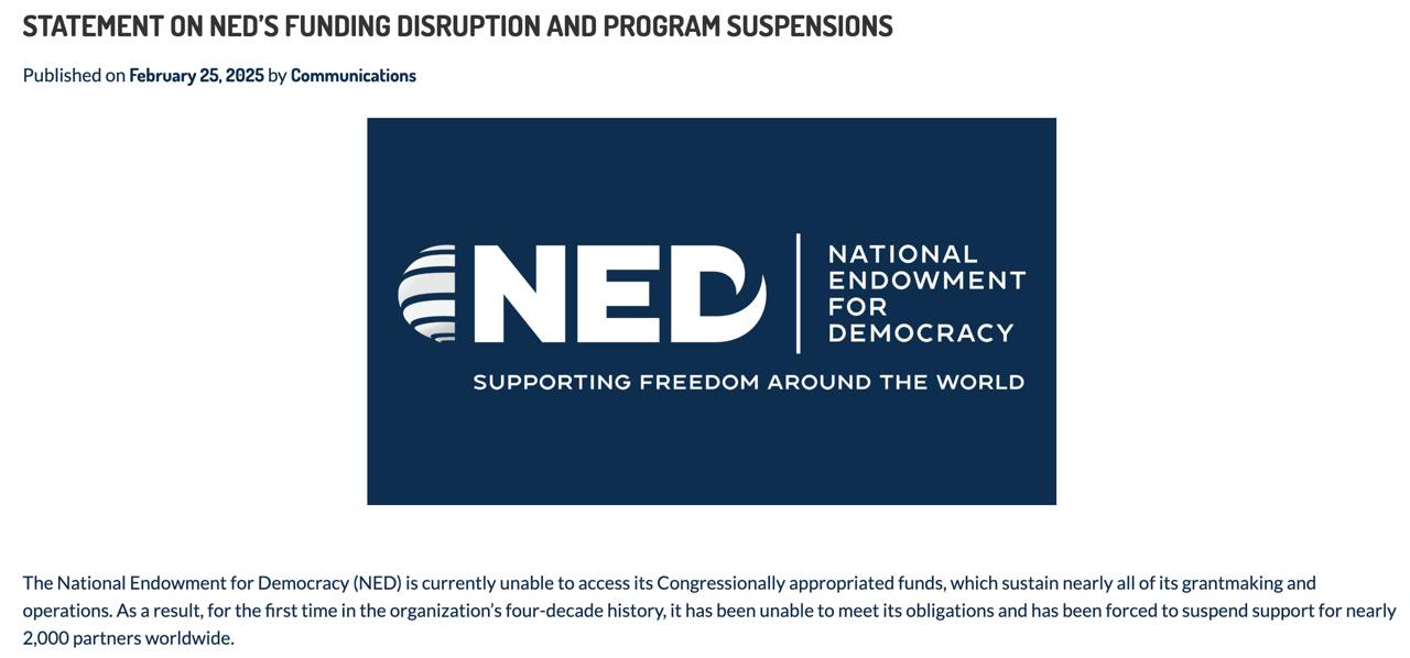 Національний фонд за демократію (NED) повідомляє, що не може отримати доступ до коштів, виділених Конгресом, які спонсорують "майже всі" його гранти та операції. Через це без фінансування залишилося майже 2000 підрядників по всьому світу.