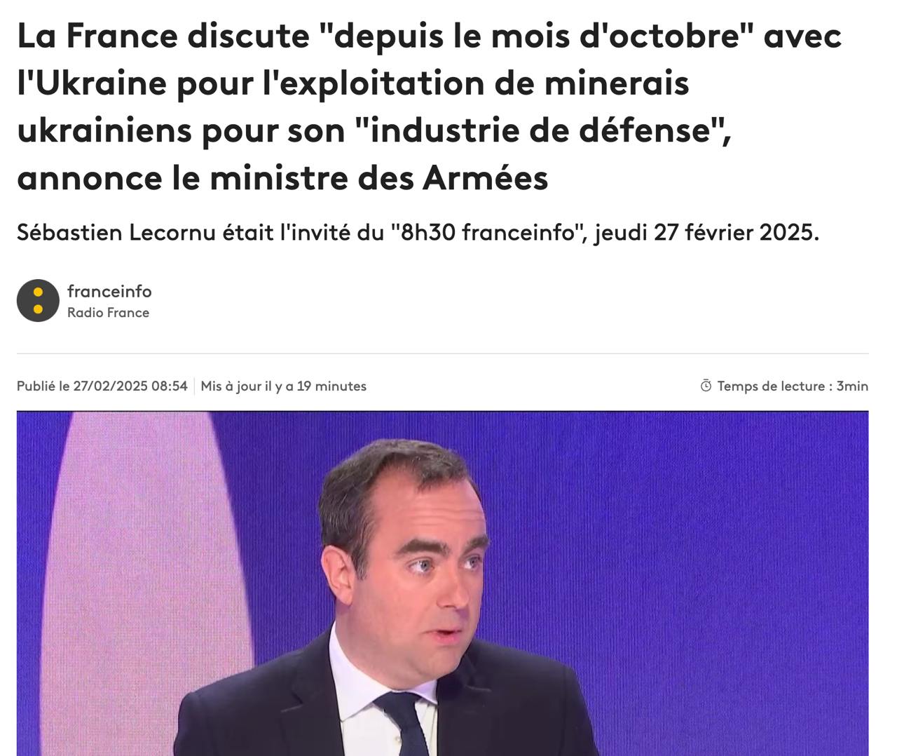 З жовтня Франція обговорює з Україною розробку її корисних копалин для потреб французької оборонної промисловості.