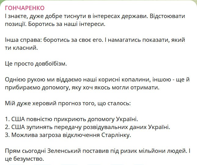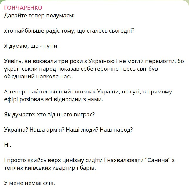 «Давайте тепер подумаємо: хто найбільше радіє тому, що сталося сьогодні? Я думаю, що — Путін. Уявіть, ви воювали три роки з Україною та не могли перемогти, тому що український народ проявив себе героїчно і весь світ підтримав нас. А тепер найголовніший союзник України, по суті, на виду у всіх порвав всі відносини з нами. Як ви думаєте: хто від цього виграє? Україна? Наша армія? Наші люди? Наш народ? Ні. І це просто верх цинізму — сидіти та вихваляти «Санича» із затишних київських квартир і барів. Я просто шокований», — також написав Гончаренко.