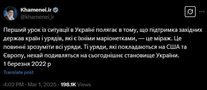 Верховний лідер Ірану висловив свою думку щодо ситуації, в якій опинилася Україна після розмови Зеленського з Трампом. Його допис з’явився в соцмережах українською мовою.