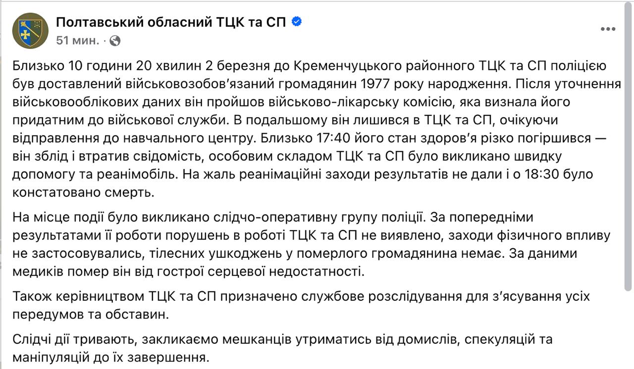 Зазначено, що 2 березня вранці чоловік 1977 року народження прибув до ТЦК і успішно пройшов ВЛК. До вечора, в очікуванні відправки до навчального центру, "його стан здоров’я різко погіршився - він зблід і втратив свідомість", а незабаром помер.