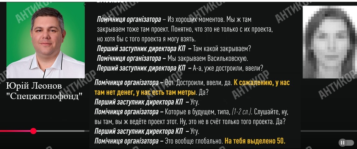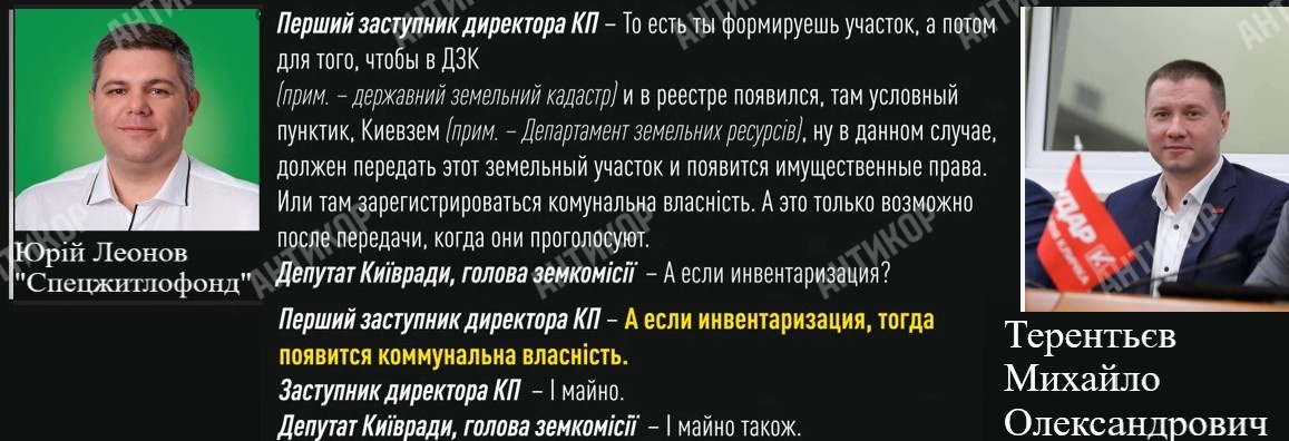 Як земля з комунальної власності переходить у приватні руки, пояснює перехоплення розмови голови земельної комісії Михайла Терентьєва та заступника директора КП «Спецжитлофонд» Юрія Леонова. Все геніальне, як бачите, просто – треба лише грамотно скласти папери та скористатися своїм впливом.