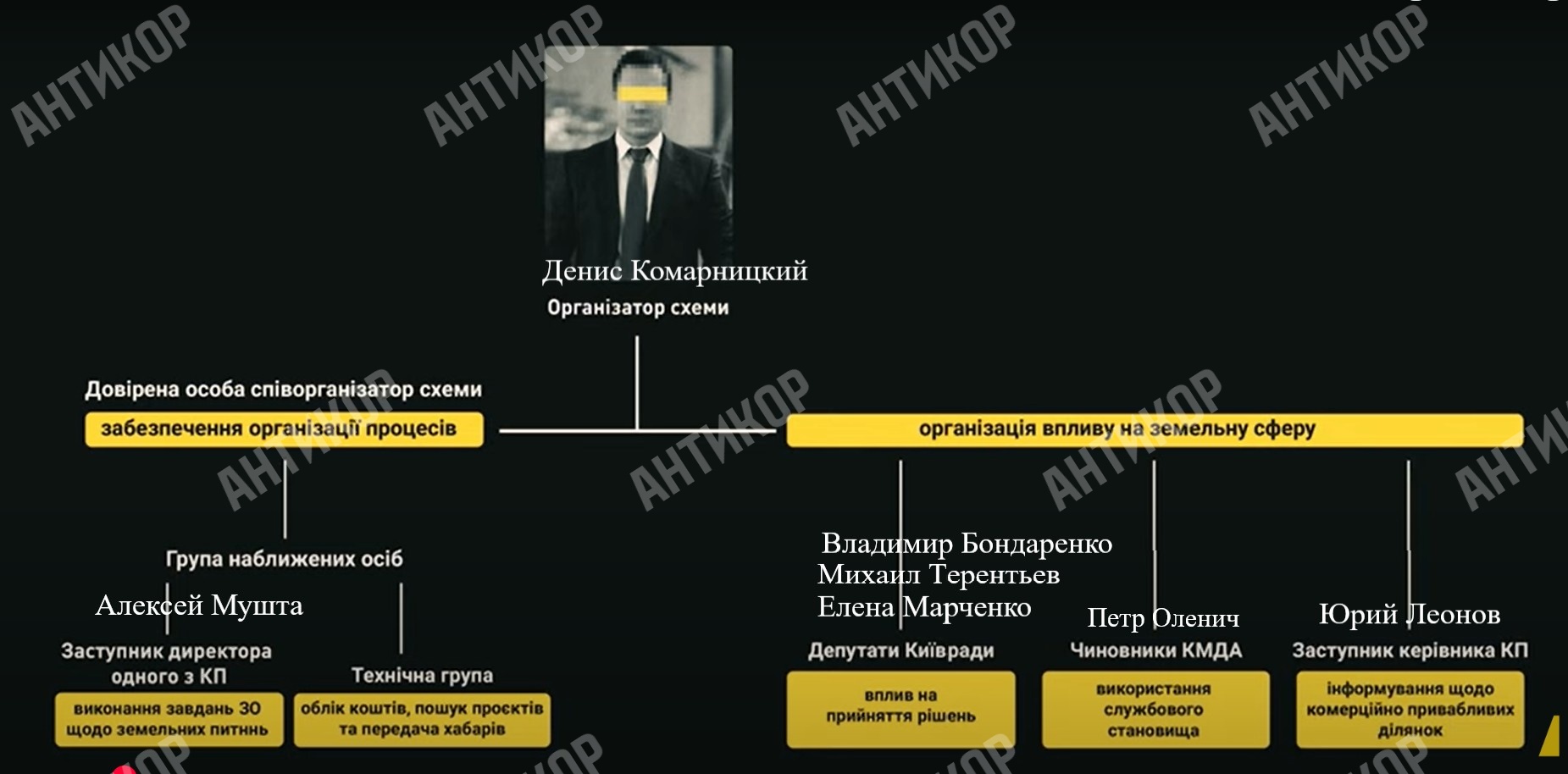 Втім, керує комісією Київради Денис Комарницький, який взагалі не має ні депутатського мандату, ні будь-якого відношення до Київради. Це підтверджується перехопленням розмови Олени Марченко з кимось з інших учасників схеми. У якій вона повідомляє, що Михайло Терентьєв «отримав грандіозної 3,14зди» від Комарницького.