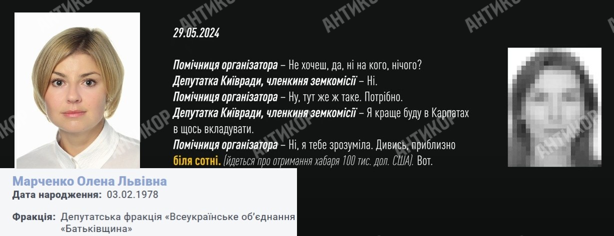 Хто саме ховається під словосполученням «довірена особа організатора схеми» – встановити зі стовідсотковою точністю наразі не вдалося. Втім, можливо, що саме вона є «особою, яка пішла на співпрацю зі слідством» - така в матеріалах кримінальної справи є, але її прізвище не називається. Далі у відео від НАБУ фігурує частина переговорів між учасниками групи, але особи сторони розмиті, а прізвища їх не називають. Хоча найчастіше здогадатися про них досить просто. Ось депутат Київради від «Батьківщини» Олена Марченко обговорює деталі своєї винагороди за добру роботу з помічницею Комарницького.