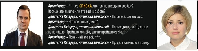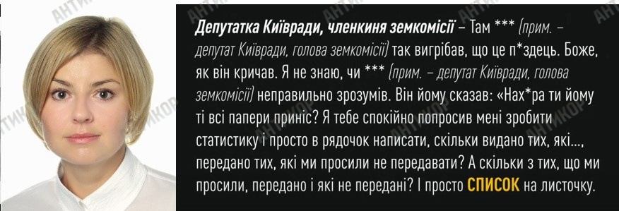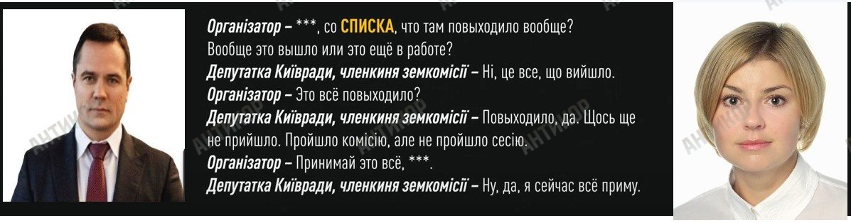 Далі на плівках від НАБУ йде обговорення деталей роботи земельної комісії, з яких складається враження, що комісією керує не Михайло Терентьєв, а Олена Марченко.