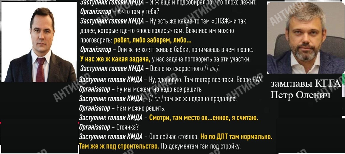 З розмови Комарницького із самим Оленичем випливає, що, по-перше, заступник голови КМДА звітує перед «смотрящим», а, по-друге, «туалетна схема» із захоплення земель Києва не єдина. Петро Оленич та Денис Комарницький обговорюють віджимання власності у членів колишньої ОПЗЖ, користуючись тим, що ті втратили свої позиції в політиці. Як каже Оленич, «я позбирав те, що погано лежить». Серед того, що «погано лежить» – земельна ділянка площею один гектар у районі НАУ. Вона отримана свого часу також порушуючи закон, тому проблем з її віджиманням не передбачається.