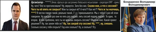Подальший злив від НАБУ передає великий та полум’яний привіт місцевому самоврядуванню у Києві та Віталію Кличку особисто. Тому що сесійною діяльністю Київради керує не його секретар Володимир Бондаренко, а Денис Комарницький, який до цієї поради не має відношення. Комарницький наказує Бондаренком закрити сесію.