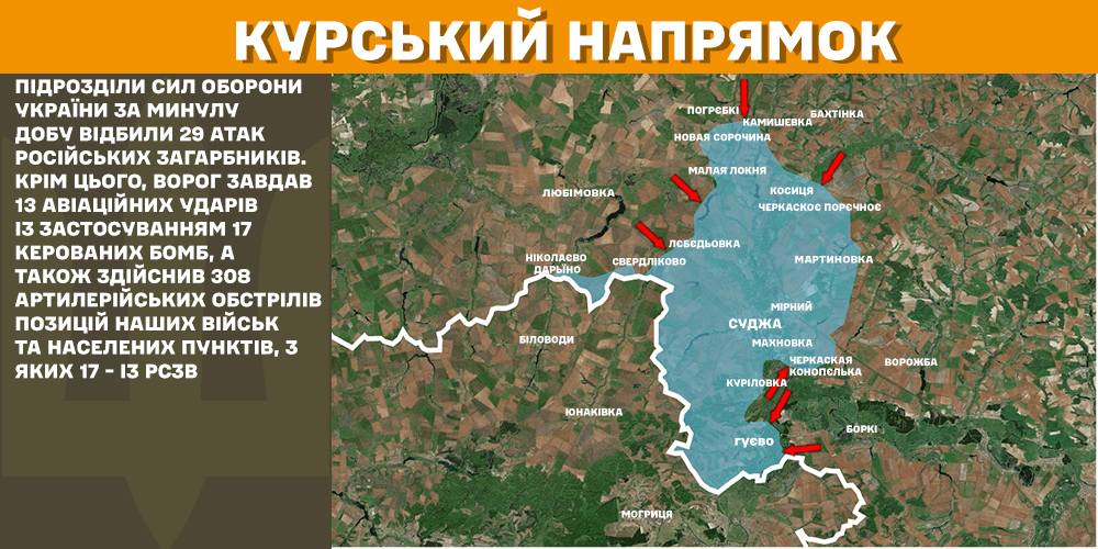 У операційній зоні на Курщині підрозділи Сил оборони України за минулу добу відбили 29 атак росіян. Окрім цього, ворог завдав 13 авіаударів із застосуванням 17 керованих бомб, а також здійснив 308 артилерійських обстрілів позицій українських військ та населених пунктів, з яких 17 - із РСЗВ.
