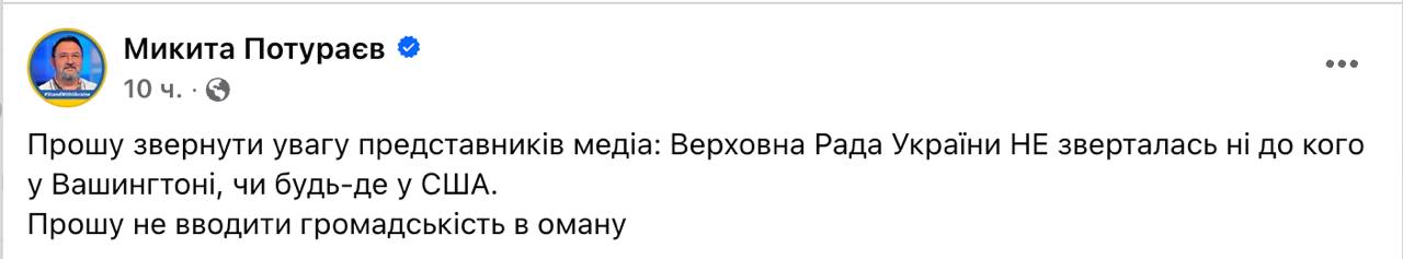 Народний депутат Микита Потураєв заявив, що Верховна Рада України не ухвалювала звернення до президента США Дональда Трампа і Конгресу на підтримку його мирних ініціатив, яке було опубліковано на офіційному сайті парламенту.