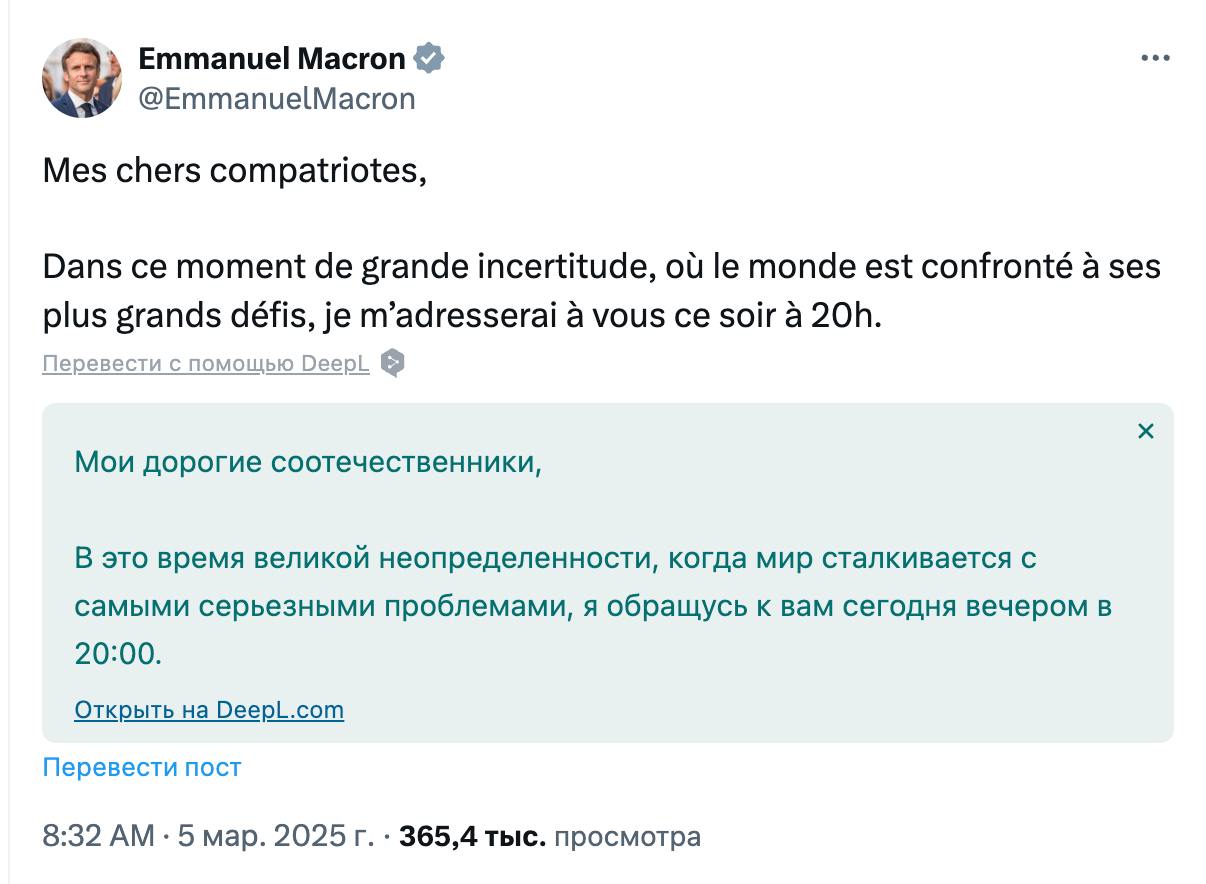 "Мої дорогі співвітчизники, у цей період величезної невизначеності, коли світ стикається з найсерйознішими викликами, я звернуся до вас сьогодні ввечері о 20:00", - зазначив президент Франції у Х.