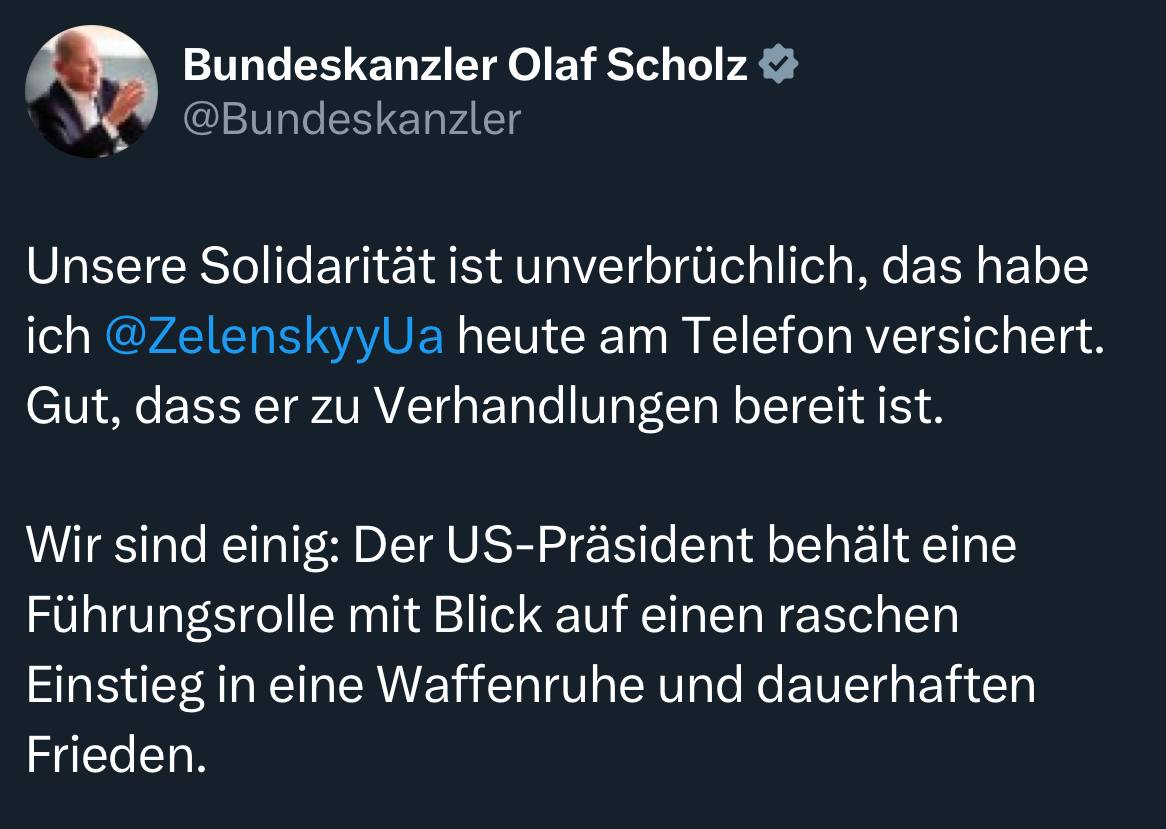«Добре, що він готовий вести переговори. Ми згодні: президент США збереже керівну роль з метою якнайшвидшого початку процесу припинення вогню та встановлення міцного миру», — заявив Шольц.