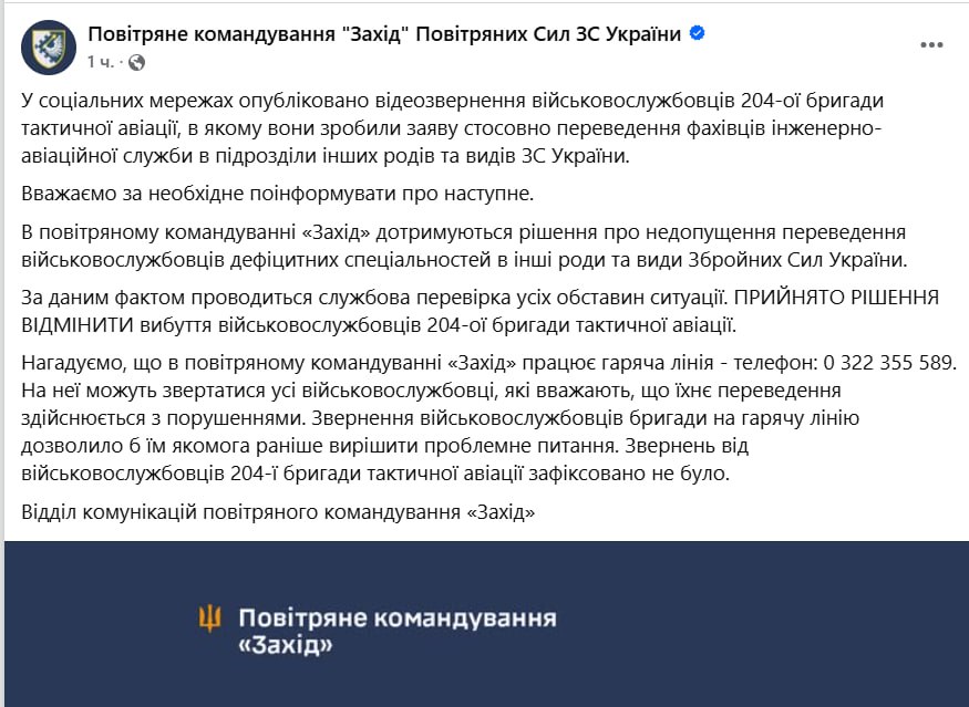 Це викликало реакцію з боку повітряного командування «Захід», яке заявило, що не допускає переведення військовослужбовців дефіцитних спеціальностей в інші роди та види Збройних Сил України.
