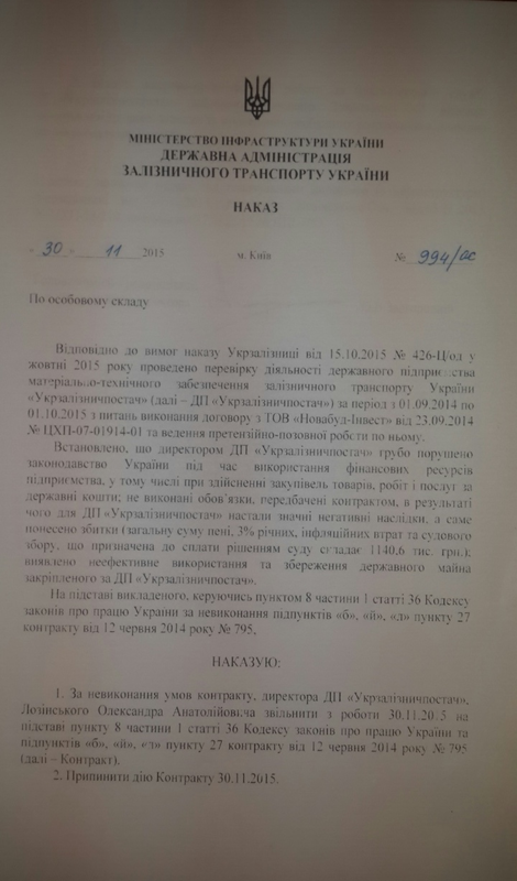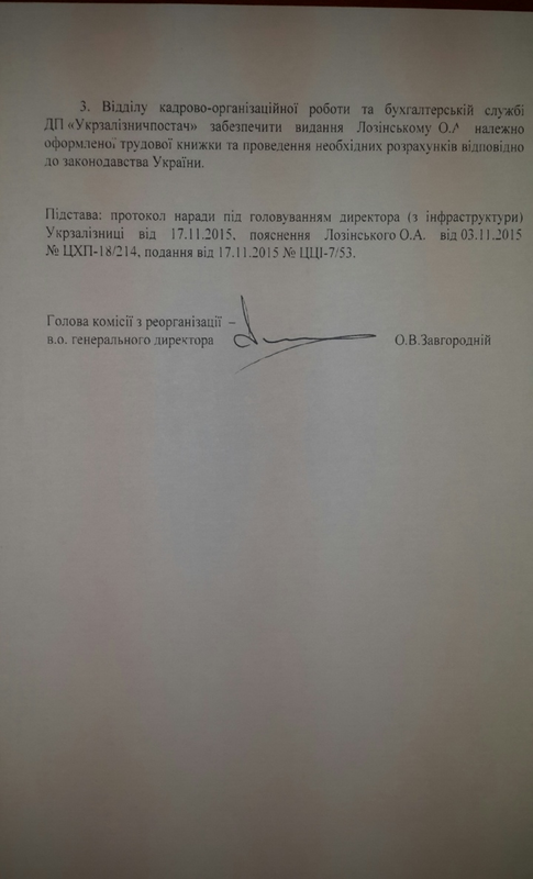 Глава госпредприятия «Укрзализнычпостач» Александр Лозинский вчера был уволен с поста меньше чем через два часа после появления интервью на портале Цензор.нет, в котором чиновник рассказал о плачевном состоянии подвижного состава «Укрзализныци», а также о фактах коррупции на госпредприятии. Скан-копию документа об увольнении экс-чиновник предоставил журналистам редакции.