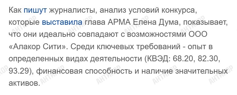 Але сюр на цьому не закінчився – через пів року АРМА робить все, щоб злити фірмі, що належить громадянину РФ Дмитру Адамовському, один з найбільших ТРЦ Києва. Звинувачення це не безпідставне – умови конкурсу, які виставила глава АРМА Олена Дума, показують, що вони ідеально співпадають з можливостями ТОВ «Алакор Сіті». Дві інші фірми, які заявили про бажання взяти участь у конкурсі, АРМА дискваліфікувала. Залишилася тільки фірма Дмитра Адамовського – ТОВ «Алакор Сіті».