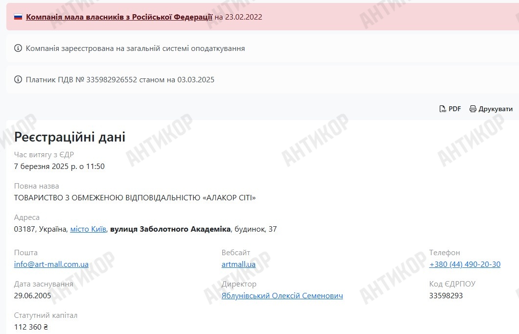 Ні факт наявності у власника ТОВ «Алакор сіті» російського громадянства, ні той факт, що в реєстрах чітко вказано, що ТОВ «Алакор сіті» має власником громадянина РФ, голову АРМА Олену Думу жодним чином не збентежило. Як і те, що Дмитро Адамовський у 2017-19 роках (як мінімум) жив у Росії. До речі, зверніть увагу не лише на червону лінію, яку «не помітила» Олена Дума, а й на адресу та вебсайт ТОВ «Алакор сіті» - artmall.ua. ТРЦ Art Mall став власністю батька Дмитра Адамовського, Андрія Адамовського, після рейдерського захоплення. За яке, звісно, йому, як і за постачання неякісного палива для армії, нічого не було.