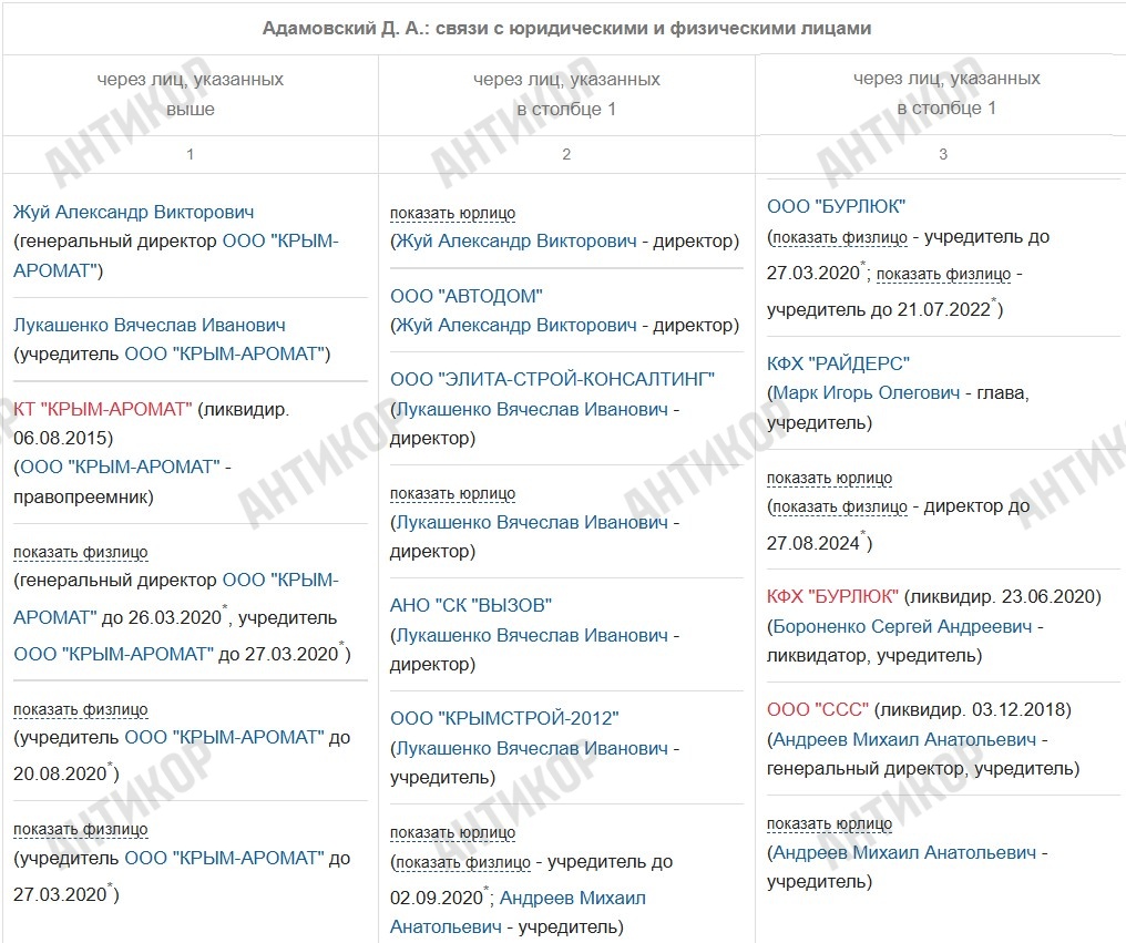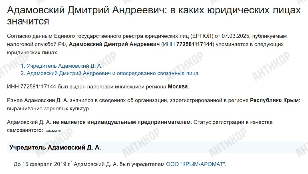 Щобільше – Дмитро Адамовський вів бізнес в окупованому Криму. За російським законодавством і як громадянин Росії. Про що недвозначно говорять російські реєстри.