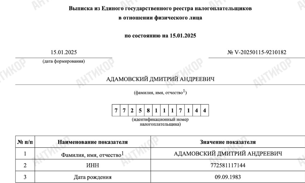 Те, що це один і той самий Дмитро Адамовський, підтверджується й довідкою про присвоєння йому Індивідуального податкового номера, виданої 15 січня 2025 року. Тобто на момент цієї дати Дмитро Андрійович Адамовський залишався громадянином Російської Федерації.