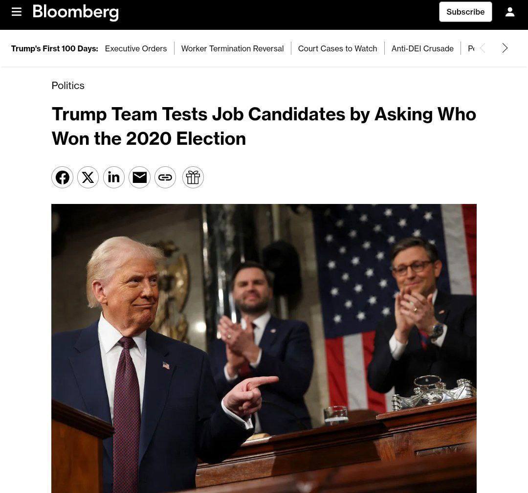 За словами джерел, на співбесідах потенційних співробітників адміністрації запитують: Чи хотіли б ви бути причетним до масових депортацій? Який із указів Трампа є вашим улюбленим? Хто переміг на президентських виборах 2020 року? З якою політикою Трампа ви не згодні?