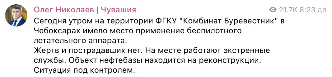 Зранку 9 березня безпілотник здійснив атаку на нафтобазу в Чебоксарах, столиці Чувашії. Це був перший випадок, коли український дрон досяг цього регіону РФ.