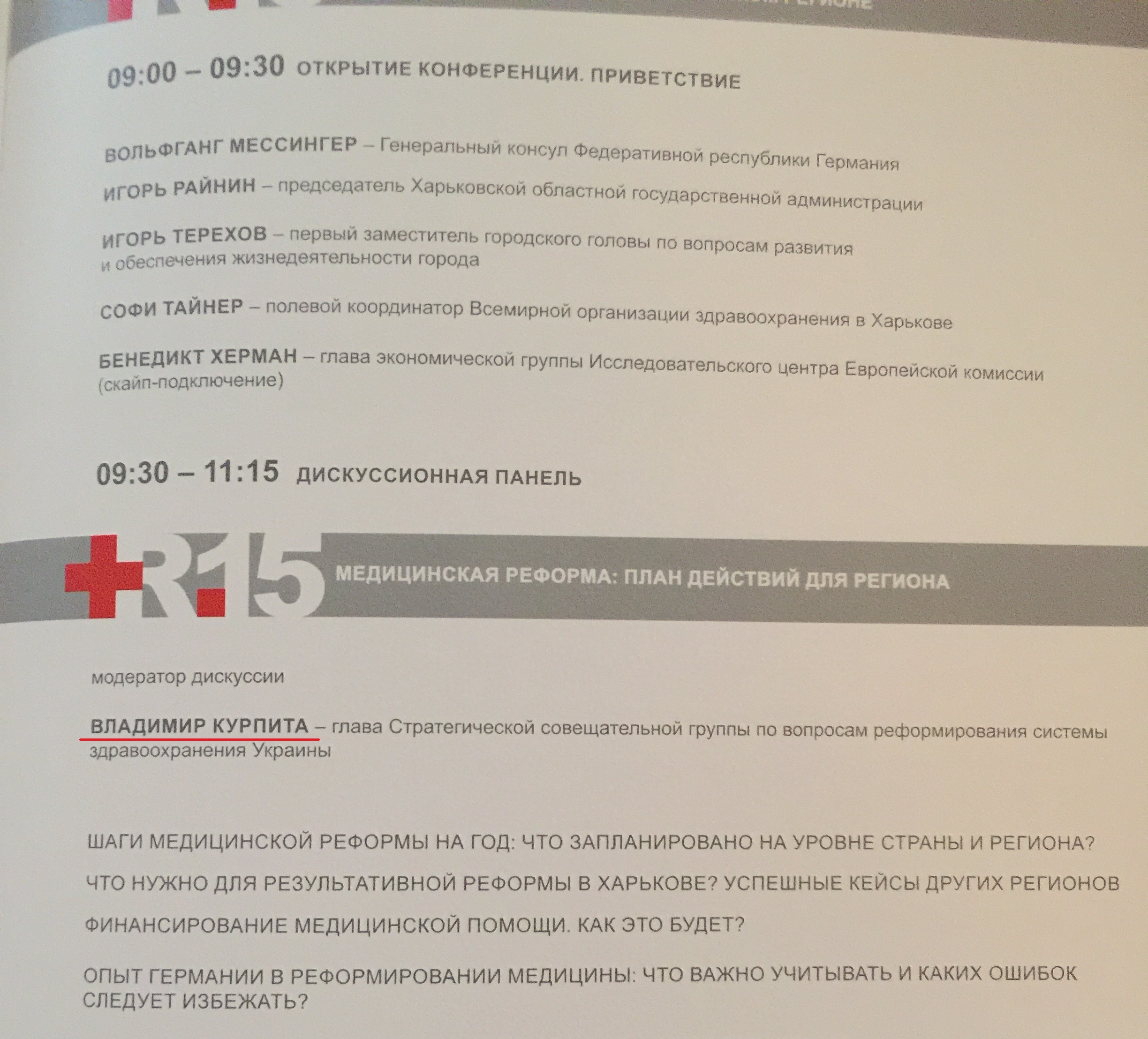 Однако 30 сентября 2015 года (через 2 недели после разыгранного совместно с экс-регионалами отрицательного вердикта законопроектам Александра Квиташвили) в Харькове проходит конференция "Международное партнерство как катализатор имплементации медицинской реформы в харьковском регионе". Модерировать тему "Медицинская реформа" организаторы, само собой, приглашают главу Стратегической совещательной группы Владимира Курпиту.