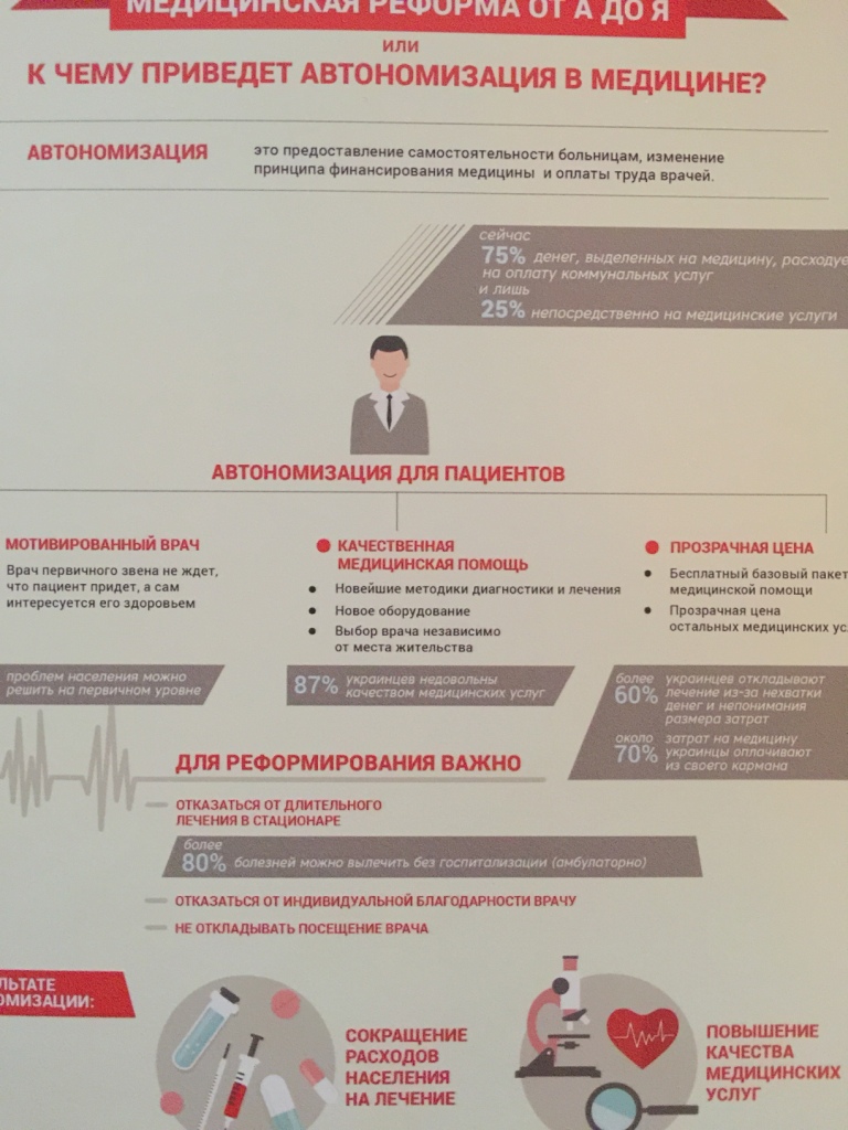 Дальше больше – гостям раздали материалы по реформе, ратующие за автономизацию медицинских учреждений. Ту самую автономизацию, которая, по словам Ольги Богомолец, должна привести к тотальной приватизации поликлиник и больниц представителями "мафии".
