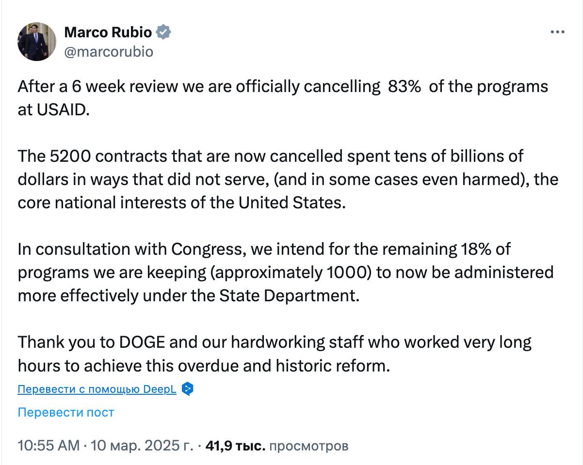 Адміністрація Трампа завершує закриття 83% програм USAID, повідомив держсекретар Рубіо.