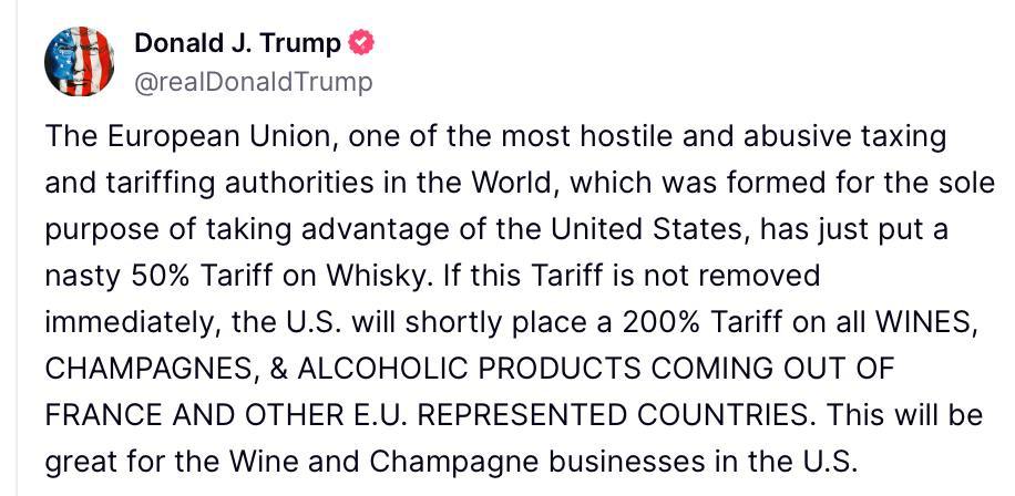 "Європейський Союз — одна з найбільш ворожих і агресивних податкових і тарифних структур у світі, створена виключно для того, щоб отримати вигоду від США, — щойно ввів відчутний 50% тариф на віскі. Якщо цей тариф не буде знято негайно, США незабаром встановлять 200% тариф на всі вина, шампанське та алкогольну продукцію з Франції та інших країн, які входять до ЄС. Це стане чудовою новиною для винного та шампанського бізнесу в США", — написав президент США у своїй соцмережі.