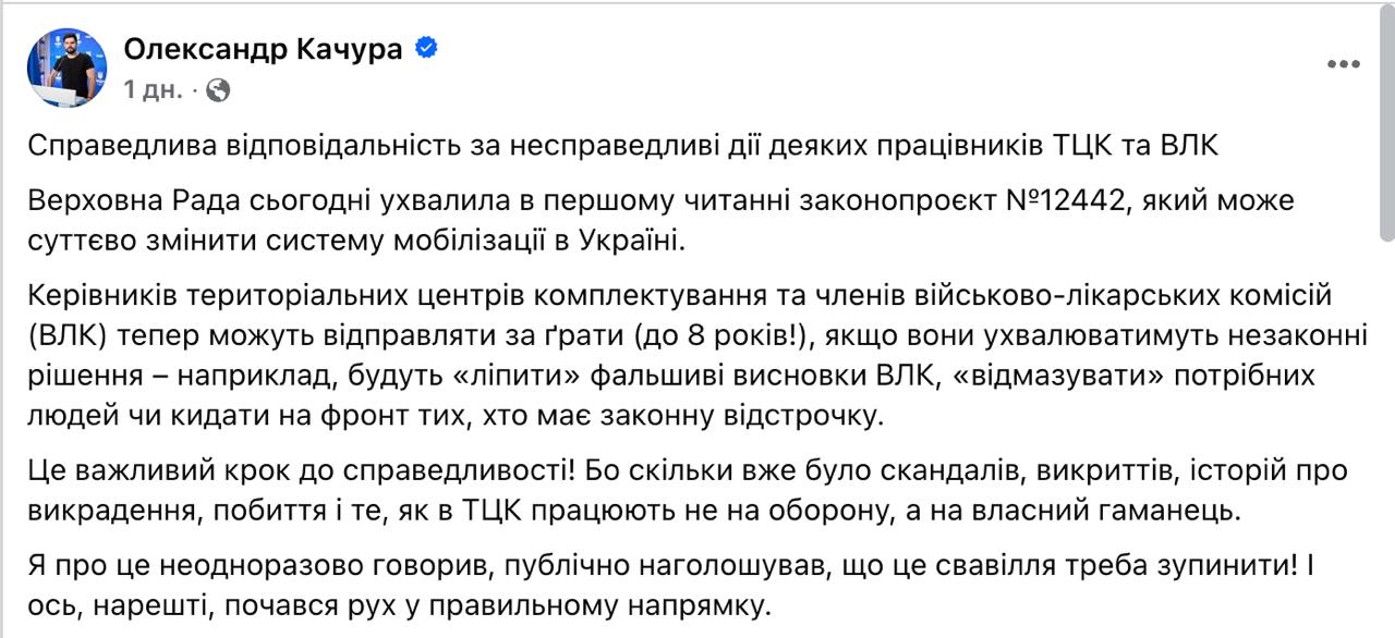 За новим законопроєктом, який представив нардеп Олександр Качура, співробітники Територіальних центрів комплектування (ТЦК) та військово-лікарських комісій (ВЛК) можуть отримати до 8 років ув’язнення за незаконну мобілізацію.
