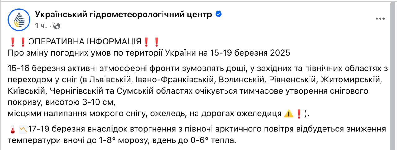 Згідно з прогнозом Укргідрометцентру, з 18 березня в кількох областях України почнеться різке похолодання, яке супроводжуватиметься снігопадами.