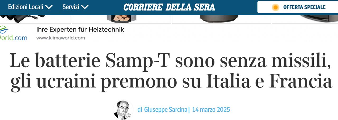 Як повідомляє італійське видання Corriere della Sera, дві батареї систем протиповітряної оборони Samp-T, надані Україні Італією та Францією, майже вичерпали свій запас ракет.