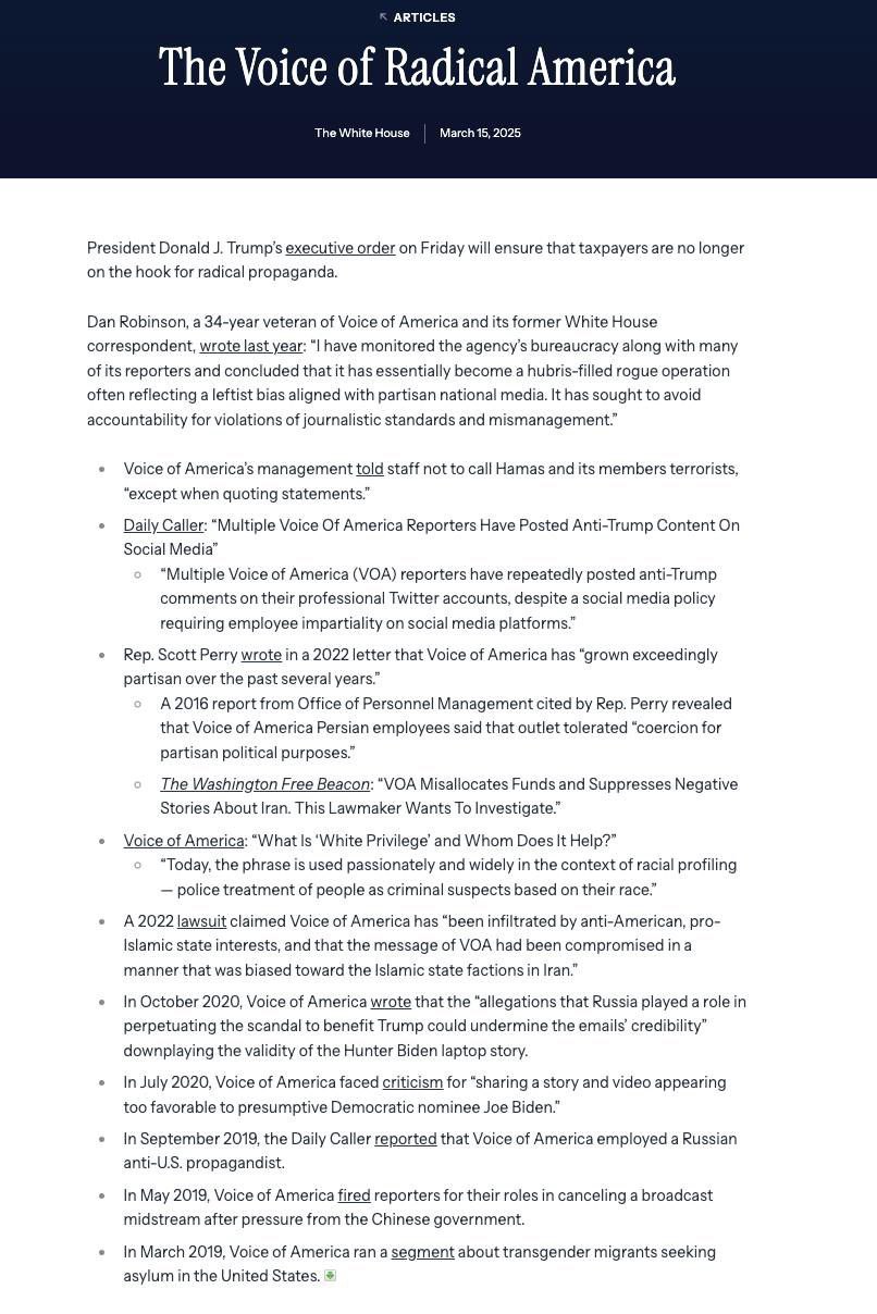 Білий дім заявив, що численні журналісти Голосу Америки неодноразово оприлюднювали антитрампівські коментарі у своїх професійних акаунтах, незважаючи на політику соціальних мереж, яка передбачає неупередженість від співробітників. Також підкреслюється, що керівництво Голосу Америки наказало працівникам не називати ХАМАС та його членів терористами, "за винятком випадків цитування заяв".