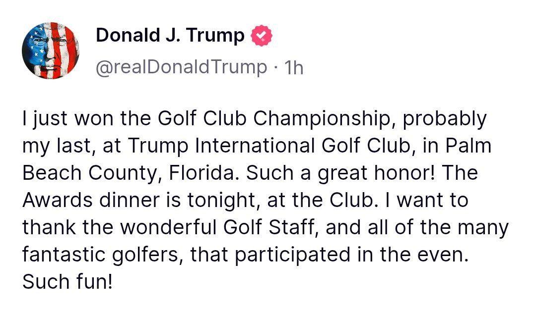 "Я щойно став переможцем чемпіонату нашого гольф-клубу, можливо, це моя остання перемога, в Міжнародному гольф-клубі Trump в окрузі Палм-Біч, штат Флорида. Це величезна честь!" - відзначив він.