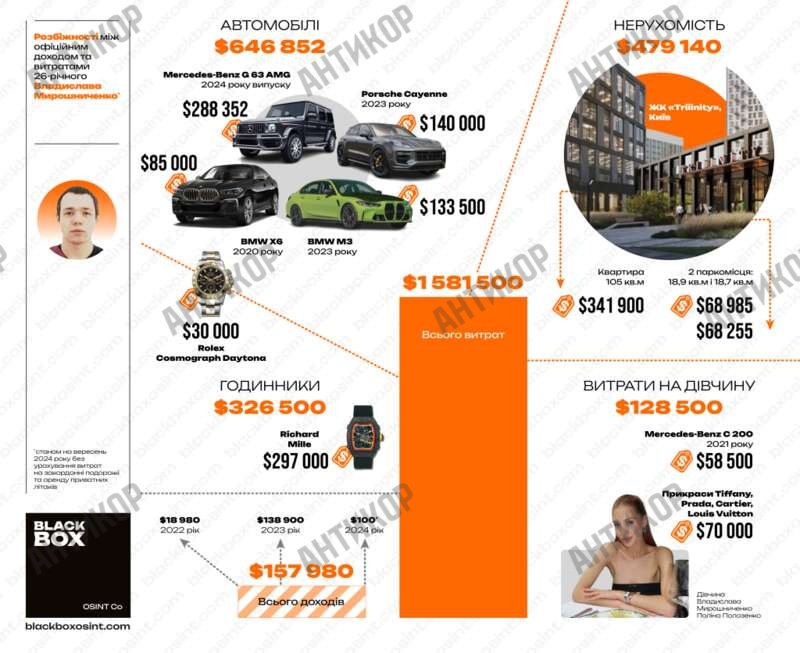 Журналісти BlackBox OSINT провели підрахунки та виявилося, що витрати Владислава Мирошниченка за останні два роки, як мінімум, в десятки разів перевищують доходи. І це стосується лише майна, яке потрібно реєструвати: автомобілі, квартири, паркування і так далі. Скільки він витратив на закордонні поїздки (а Владислав Мирошниченко, попри свій призовний вік і воєнний стан, перетинав кордон України не менш ніж вісім разів), підрахунку піддається з великими труднощами.