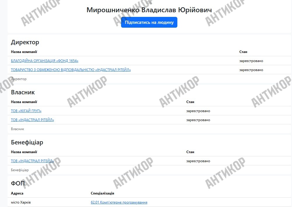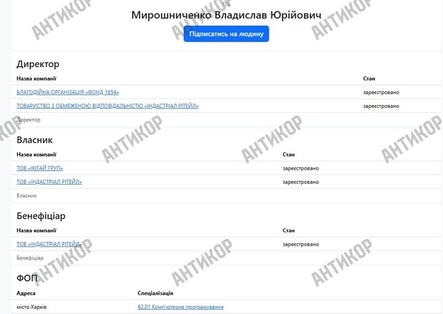 Розслідувачі наголошують на тому факті, що ще у 2022 році Владислав Мирошниченко був звичайним кальянником в одному з барів Харкова. А через кілька місяців після початку великої війни раптом випірнув у Києві вже як доларовий мільйонер і криптогуру. На цей час він володіє кількома підприємствами та зареєстрований як підприємець, однак жоден з цих суб’єктів економічної діяльності та близько не демонструє доходів, які могли б пояснити походження капіталів новоспеченого мультимільйонера Владислава Мирошниченка.
