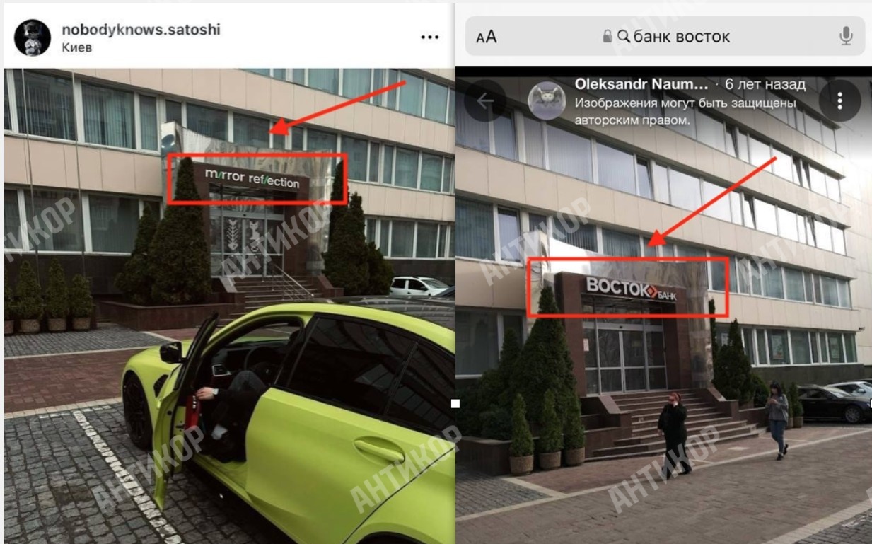 До того ж проєкт Mirror Reflection, який нібито займається продажем курсів з трейдингу і за допомогою якого Владислав Мирошниченко заробляє собі на життя, явний фейк, причому зроблений досить халтурно: приміщення, яке Мирошниченко видає за свій київський офіс, це – відфотошоплене приміщення банку «Схід», а іспанський «офіс» Mirror Reflection – це такий самий відфотошоплений магазин велосипедів.