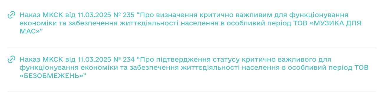 Такий статус встановлено відповідно до наказу Мінкультури від 11 березня для ТОВ "БЕЗОБМЕЖЕНЬ" (рок-гурт "Без обмежень") та ТОВ "Музи для мас" (гурт "Бумбокс").