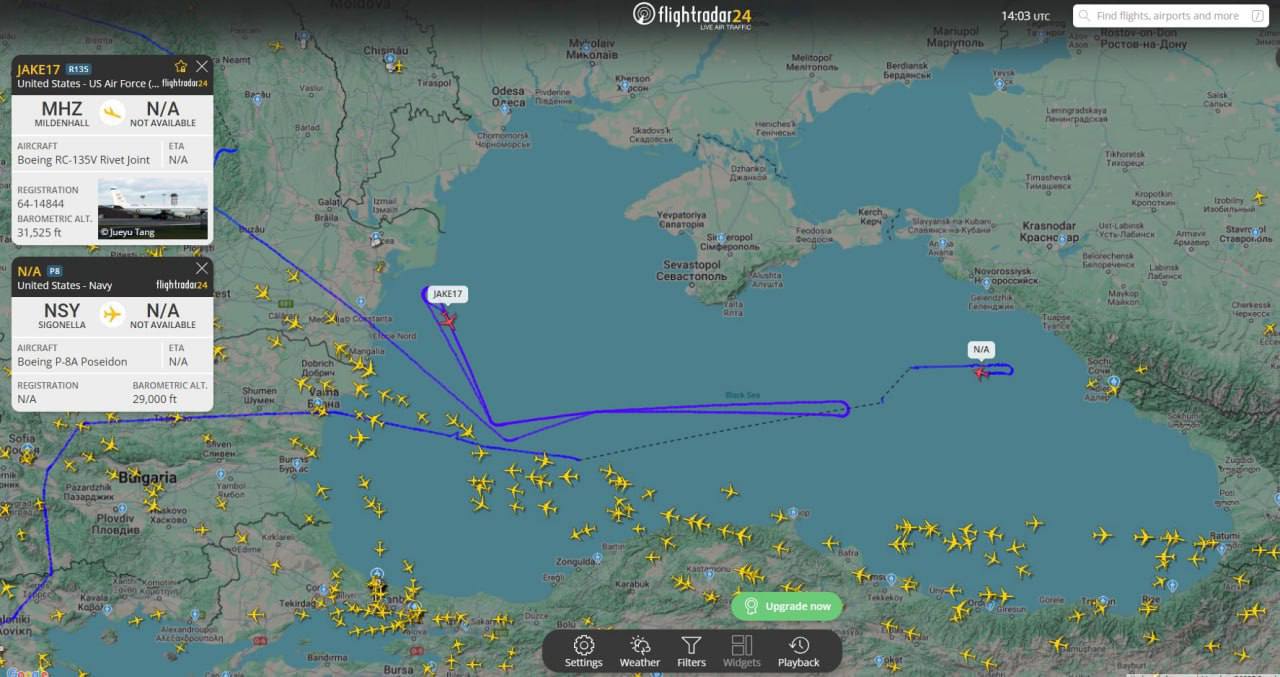 Крім того, над Чорним морем працює літак радіоелектронної розвідки RC-135V Rivet Joint, який здійснює моніторинг військової активності РФ у регіоні. Попри близькість до російських кордонів, жодних спроб збити літак з боку російських сил не зафіксовано.