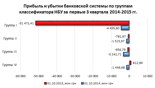 В целом по банковской системе группа крупнейших банков поставила за три квартала 2015 года антирекорд; увеличив показатели прошлого года почти в 12 раз и получив 51,5 млрд грн убытка, крупные и средние финучреждения сумели сократить убыток, тогда как прибыль показала лишь группа мелких банков.