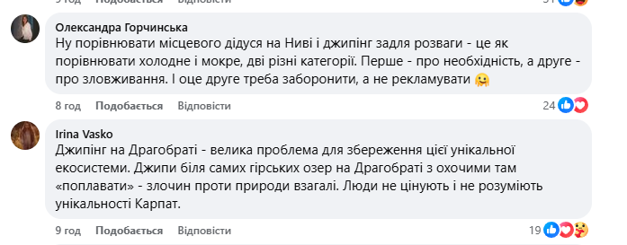 "Це те з чим треба боротися, а не пропагувати. Джипи руйнують екосистему гір, створюють шрами, які ніколи не заживають. Дмитре, допоможіть зупинити цю навалу, бо в комбо з вітряками ми просто втратимо наші гори назавжди. Я тут мешкаю і знаю про це не з чуток", — написала Антоніна Іванова.