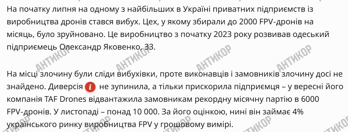 Тоді громадськість розцінила це як «наїзд» влади на волонтерів і, скоріш за все, саме так воно й було. Тим більше, що хвиля звинувачень у бік волонтерів була масовою та одним Яковенком і однією Одесою не обмежилася. Що стосується Олександра Яковенка, то він заснував компанію-виробника дронів TAF Drones, яка станом на кінець 2024 року вийшла на цифру 40 000 FPV‑дронів на місяць. До слова, у липні минулого року в одному з цехів підприємства, де збирали до 2000 FPV‑дронів на місяць, пролунав вибух, який його зруйнував. Це була очевидна диверсія, однак виконавців і замовників злочину досі не знайдено.