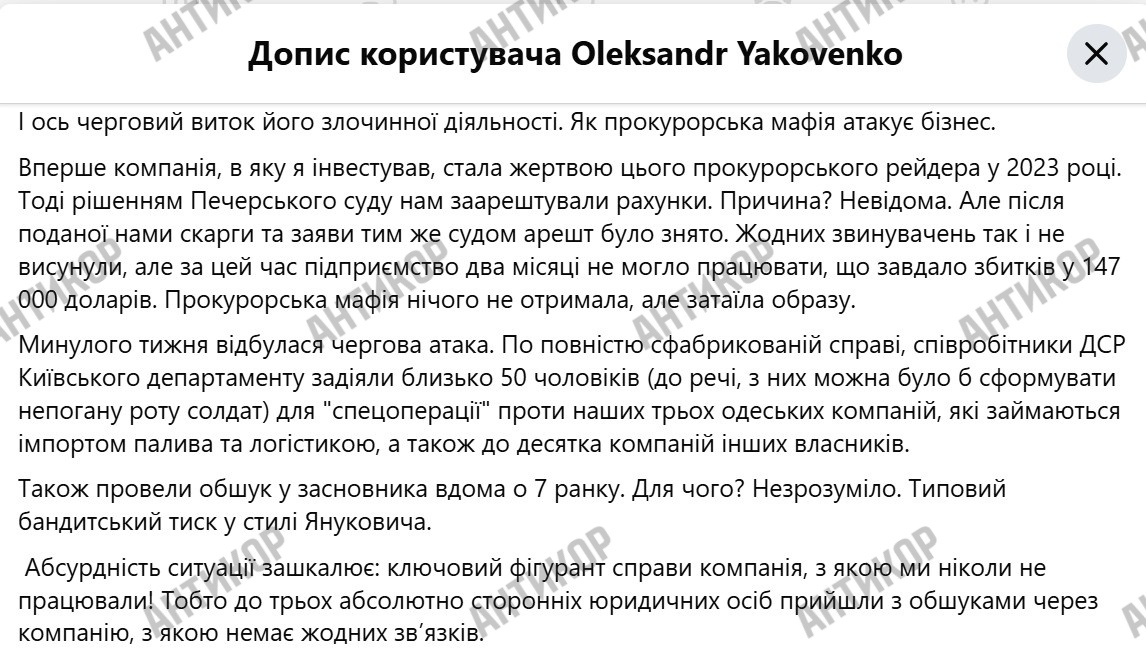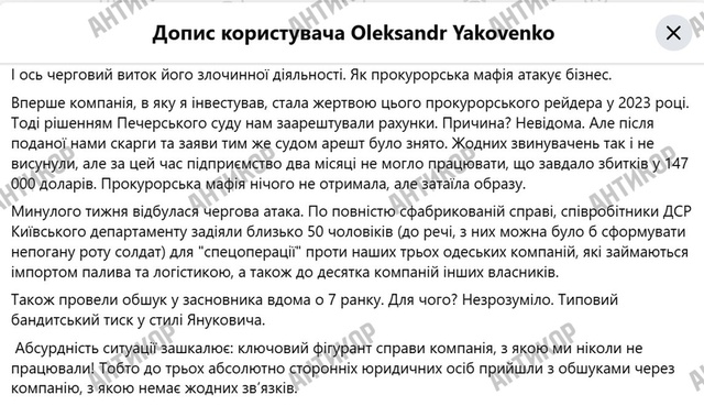 Тому повідомлення Олександра Яковенка про обшуки в офісах його компаній, які відбулися 12 березня, цілком логічно викликали підозри, що у такий спосіб росіяни руками проросійськи налаштованих правоохоронців знову намагаються знищити виробництво дронів. На це, власне, досить прозоро натякнув і сам Олександр Яковенко, розмістивши на ФБ пост, де звинуватив у атаці на свій бізнес прокурора другого відділу процесуального керівництва Генеральної прокуратури за додержанням законів Національною поліцією України Чорного Ігоря Олександровича. Якого прямо назвав «професійним корупціонером та перевертнем в погонах» і додав, що у 2016 році Чорного арештовували за хабар. До всього ж, як випливає з допису Олександра Яковенка, прокурор Ігор Чорний не вперше «наїжджає» на бізнес Яковенка.