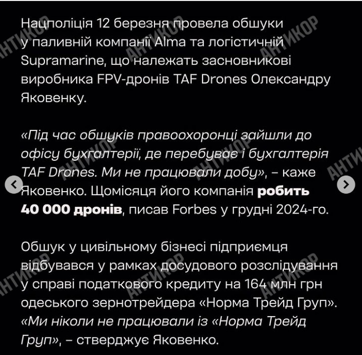 Як повідомив Forbes Ukraine, 12 березня у компаніях власника виробника дронів TAF Drones Олександра Яковенка пройшли обшуки, внаслідок чого робота з виробництва дронів була заблокована.