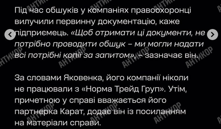 У державних реєстрах є ціла низка судових рішень щодо ТОВ «Норма трейд груп», зокрема, й за кримінальною справою, однак у жодному з них немає згадок про податковий кредит. Кримінальна справа № 42024160000000019 (судова справа № 947/22124/24), у якій фігурує ТОВ «Норма трейд груп», стосується створення умов для банкрутства та незаконного заволодіння майном, однак жодним чином не говорить про податковий кредит. Тому дізнатися з відкритих джерел, чому в офісах Олександра Яковенка відбулися обшуки, не вдалося. За словами самого Яковенка, у цій справі фігурує одна з його бізнес-партнерок, однак, якщо це дійсно так, то все одно позиція Національної поліції, м’яко кажучи, видається дивною. Особливо на фоні заяви Олександра Яковенка щодо причетності до справи прокурора Чорного.
