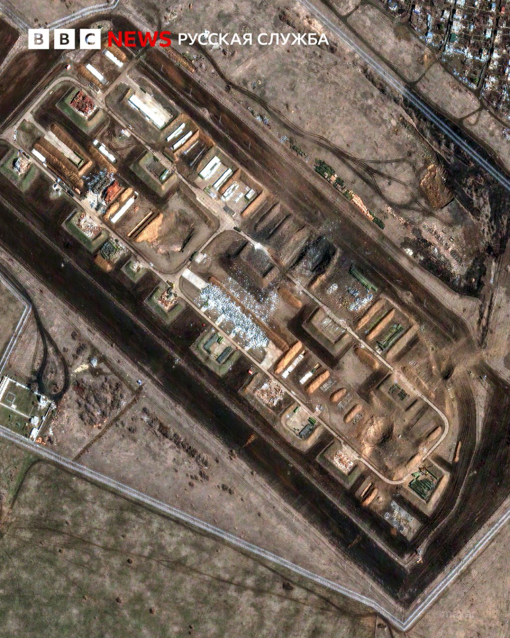 На знімках видно, що склад знаходиться на відстані від місць стоянки літаків. Неподалік від складу — за 200 метрів від його крайньої точки — розташовується межа дачного селища.