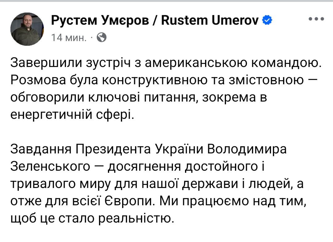 "Завершили зустріч з американською командою. Розмова була конструктивною та змістовною — обговорили ключові питання, зокрема, в енергетичній сфері", - заявив міністр оборони.