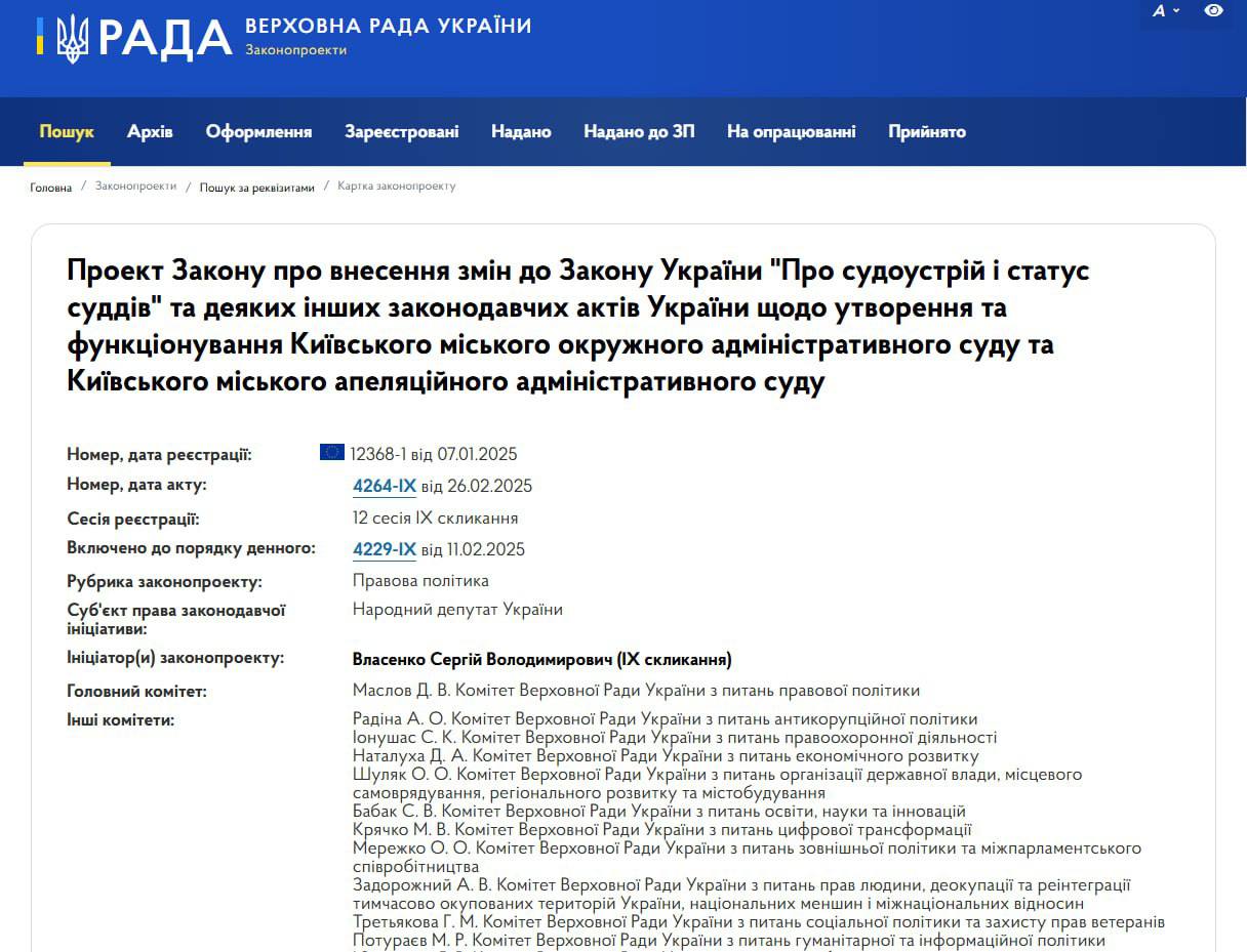 Верховна Рада 26 лютого 234 голосами проголосувала в цілому за закон №12368-1 про створення Вищого адміністративного суду, що передбачає заснування двох судів – Спеціалізованого окружного адміністративного суду і Спеціалізованого апеляційного адміністративного суду до вищих спеціалізованих судів.