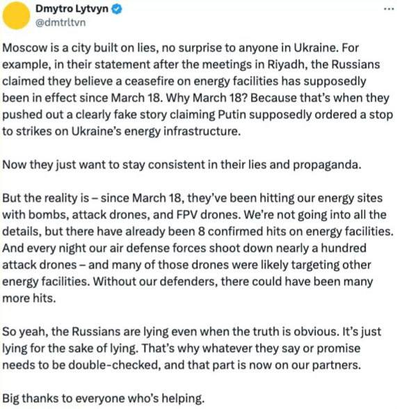 Водночас радник Зеленського Литвин інформує, що РФ завдала 8 ударів по енергетичних об’єктах України після 18 березня, тим самим спростовуючи заяву ЗМІ.