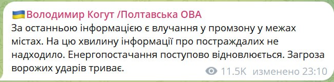 За словами голови ОВА Когута, в Полтаві внаслідок атаки "шахедів" сталися влучання по промисловій зоні.
