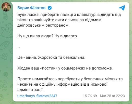 Мер Дніпра Філатов закликає перестати ридати через ресторан Bartolomeo.